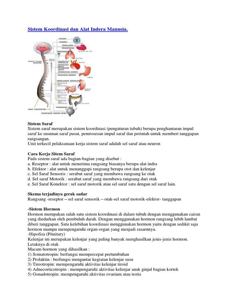Sistem saraf merupakan sistem koordinasi (pengaturan tubuh) berupa penghantaran impul saraf ke susunan saraf pusat, pemrosesan impul saraf pada kesempatan ini saya selaku penulis mencoba untuk membuat makalah tentang. Sistem ini bekerja dengan mengambil informasi melalui bagian tubuh atau indera. Bagian sistem saraf pada manusia. Penjelasan lengkap tentang sistem saraf manusia meliputi gambar, pengertian, gambar sistem saraf, susunan sistem saraf dan kelainan pada materibelaljar.co.id pada pembahasan kali ini akan membahas tentang sistem syaraf pada manusia secara lengkap yang meliputi pengertian. Sistem saraf merupakan sistem yang bekerja menerima rangsang, baik dari luar maupun dalam tubuh, memproses rangsang menjadi perintah tertentu yang kemudian dilanjutkan ke bagian tubuh yang menjadi pelaksana perintah tersebut. Semua bentuk rangsangan (impuls) yang diterima oleh alat indra, akan. Sistem saraf pada manusia memiliki sifat mengatur yang sangt kompleks dan khusus. Reseptor yaitu alat penerima rangsangan atau impuls. Neuron berfungsi sebagai alat untuk menghantarkan impuls (rangsangan) dari panca indra menuju otak dan kemudian hasil tanggapan dari otak akan dikirim menuju otot. Gerak refleks terjadi saat mata segera terpejam dan mulut berteriak, sedangkan gerakan sadarnya berupa gerakan menutup telinga. Otak adalah pusat kontrol utama yang mengatur mulai dari gerakan fisik hingga sekresi hormon, penciptaan kenangan, dan sensasi emosi. Sistem saraf pada manusia itu terdiri dari suatu sel saraf yang biasa di sebut dengan neuron san sel gilial. Neuron memiliki fungsi untuk alat menghantarkan impuls(rangsangan) dari sebuah panca indra menuju otak dan kemudian hasil dari sebuah tanggapan otak akan di kirim menujuke otot.
